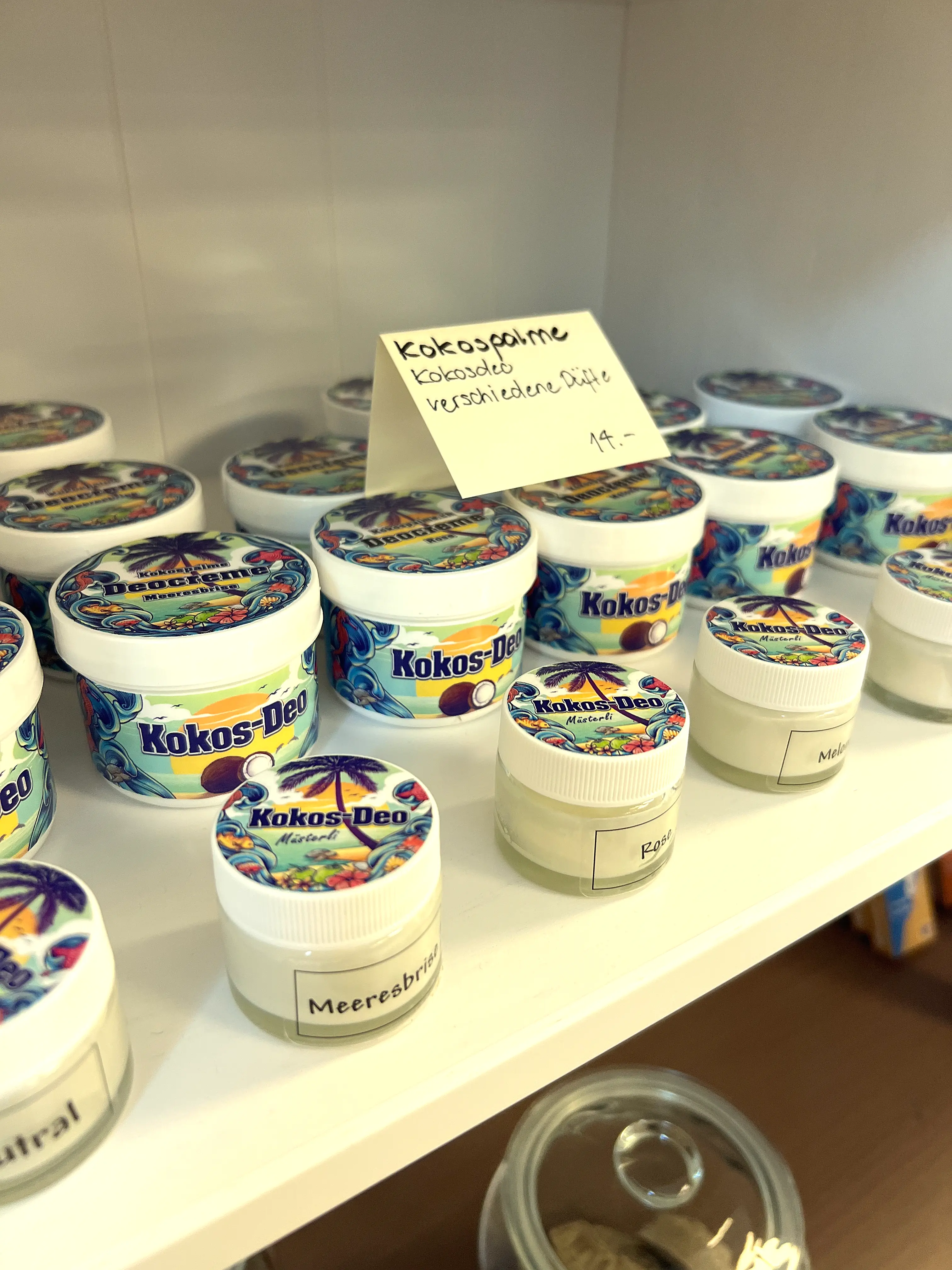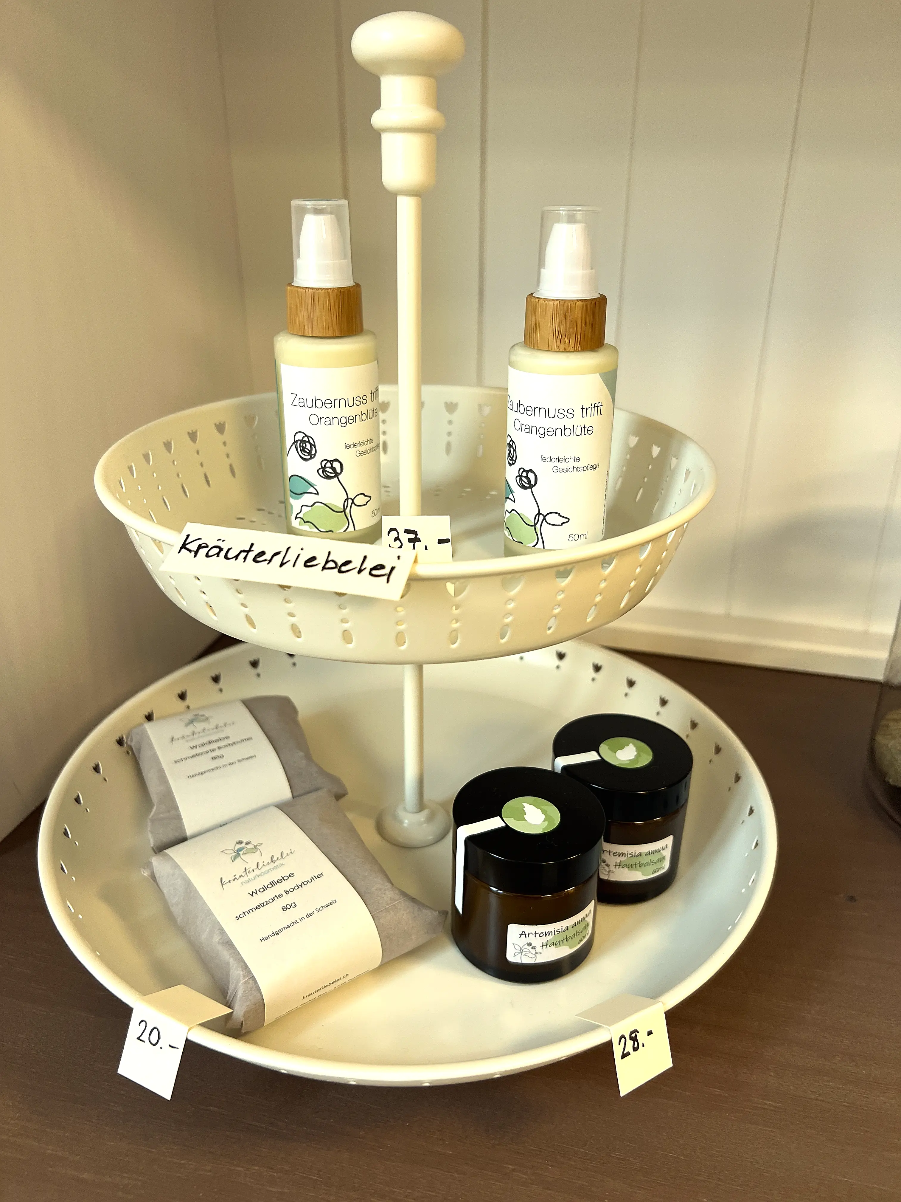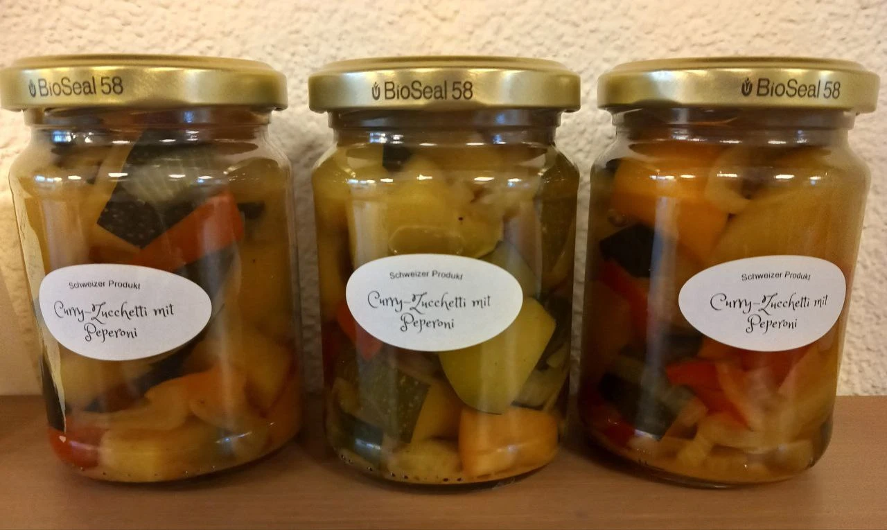 Getränke, Oliven, Chips aus Kallnach, Mandelmus, Tomatensauce, Kokosfett, Joghurt und Butter - auch rein pflanzlich, verschiedene Aufstriche, unter anderem Fruchtaufstriche aus der Region mit wenig Zucker