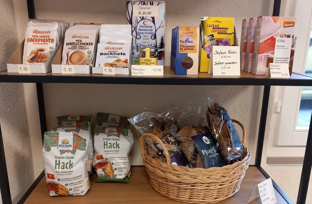 Teigwaren aus der Region, Reis, Linsen, Mehl, BIO Kaffee, Kaffee von Café Grand Rue, Essig, Öle, Gewürze, Kräuter, Trockenfrüchte, Müesli, Cornflakes, Eier und vieles mehr, wenn immer möglich in Bio Qualität